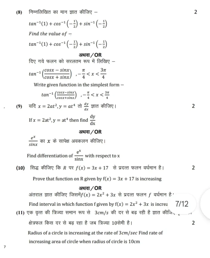 MPBSE 12th Math board paper 2026