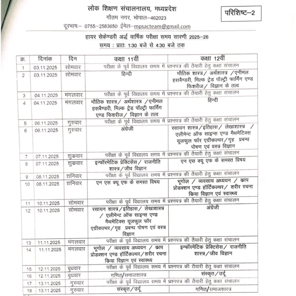 एमपी बोर्ड मध्य प्रदेश शिक्षा विभाग के द्वारा कक्षा 11वीं और 12वीं की अर्धवार्षिक परीक्षा का आयोजन 3 नवंबर 2025 से प्रारंभ होकर 13 नवंबर 2025 तक किया जाएगा परीक्षा का समय धोखा 1:30 बजे से 4:30 तक सुनिश्चित किया गया है। कक्षा 11वीं कि विद्यार्थियों की अर्धवार्षिक परीक्षा में पहली परीक्षा हिंदी विषय की होगी वही कक्षा 12वीं की विद्यार्थियों के लिए पहली परीक्षा भूगोल अर्थशास्त्र की होने वाली है।