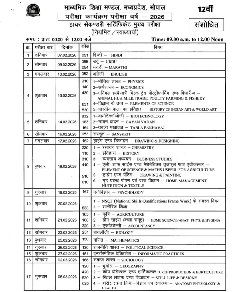 एमपी बोर्ड कक्षा 12वीं की वार्षिक परीक्षा टाइम टेबल में संशोधन किया गया है कक्षा 12वीं वार्षिक परीक्षा का टाइम टेबल नीचे देख सकते हैं। इसमें 3 तारीख को होने वाली भूगोल की परीक्षा अब 5 मार्च 2026 को होगी।